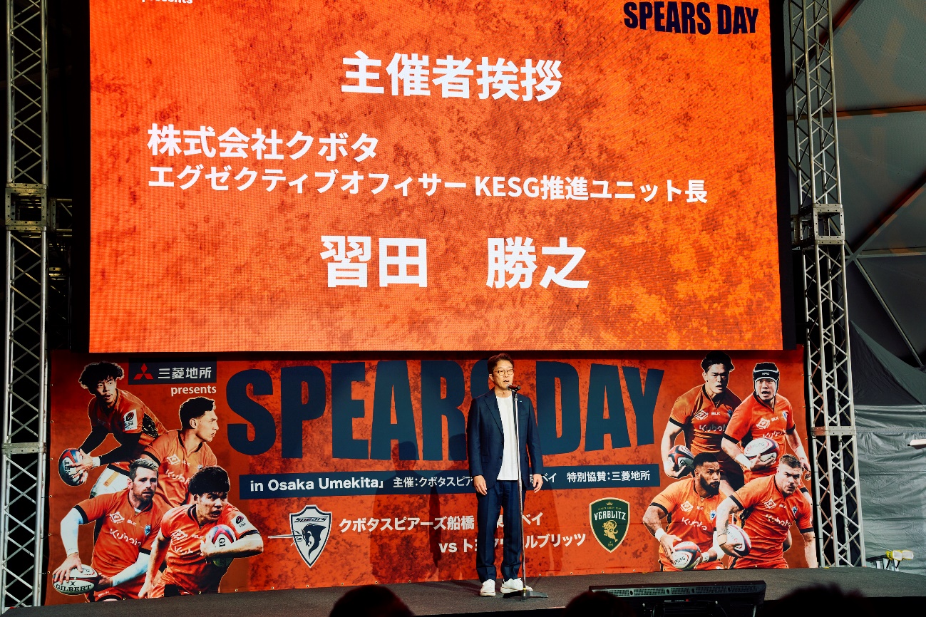↑イベント冒頭、挨拶に立った株式会社クボタの習田勝之氏。「チームは悲願のレギュラーシーズン1位を目指し、残り試合を一つひとつしっかり戦っていきたいと考えています。また、クボタにはバレーボールチーム『クボタスピアーズ大阪』もあります。ラグビーやバレーボールといったスポーツを通じて、地域の活性化や皆様とのつながり、さらには企業同士の連携も広げていければと考えています。クボタとしても、クボタスピアーズ船橋・東京ベイ、そしてクボタスピアーズ大阪の活動に、引き続き力を入れて取り組んでまいります」
