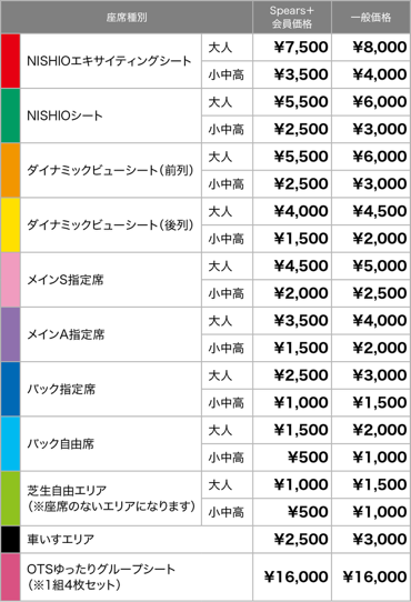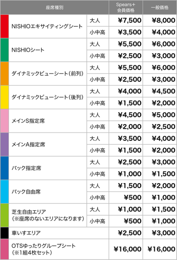 | 販売席種 | NISHIOエキサイティングシート(特典付き)、NISHIOシート ダイナミックビューシート(前列)、ダイナミックビューシート(後列)、 メインS指定席、メインA指定席、バック指定席、バック自由席 |