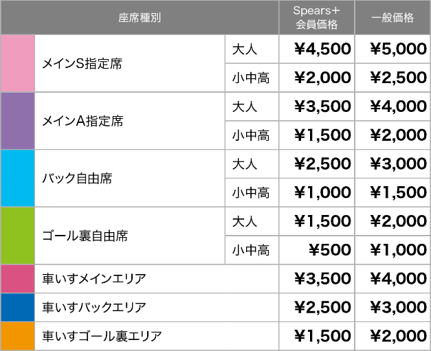 | 販売席種 | メインSS指定席、メインS指定席、メインA指定席 バック指定席、バック自由席 ゴール裏自由席 |
