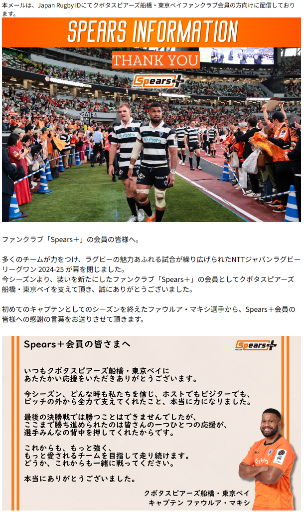 | 対象 | クボタスピアーズ船橋・東京ベイ公式ファンクラブSpears+会員 |