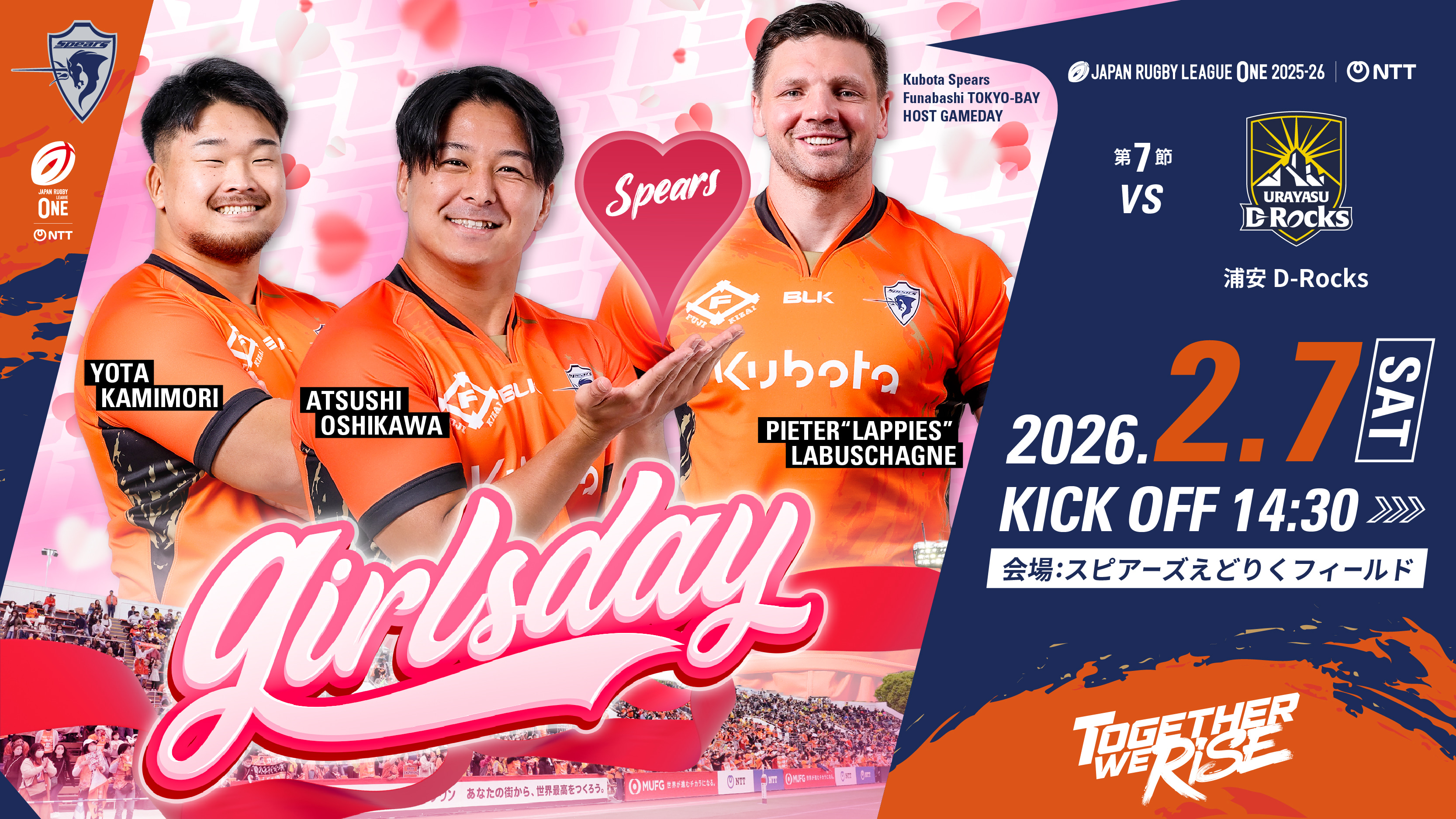 | 対象試合 | NTTジャパンラグビーリーグワン2025-26 第7節 2026年2月7日(土) 14時30分 キックオフ クボタスピアーズ船橋・東京ベイ vs 浦安D-Rocks |