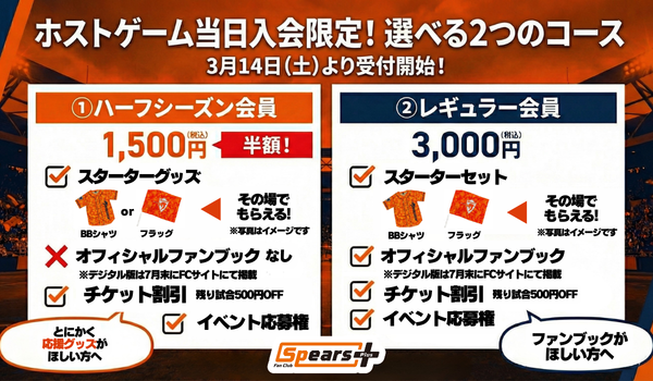 「まだファンクラブに入っていないけれど、スピアーズを応援したい!」という皆さまに、より気軽にご入会いただけるよう、この度「ハーフシーズンプラン」を新設いたしました。
