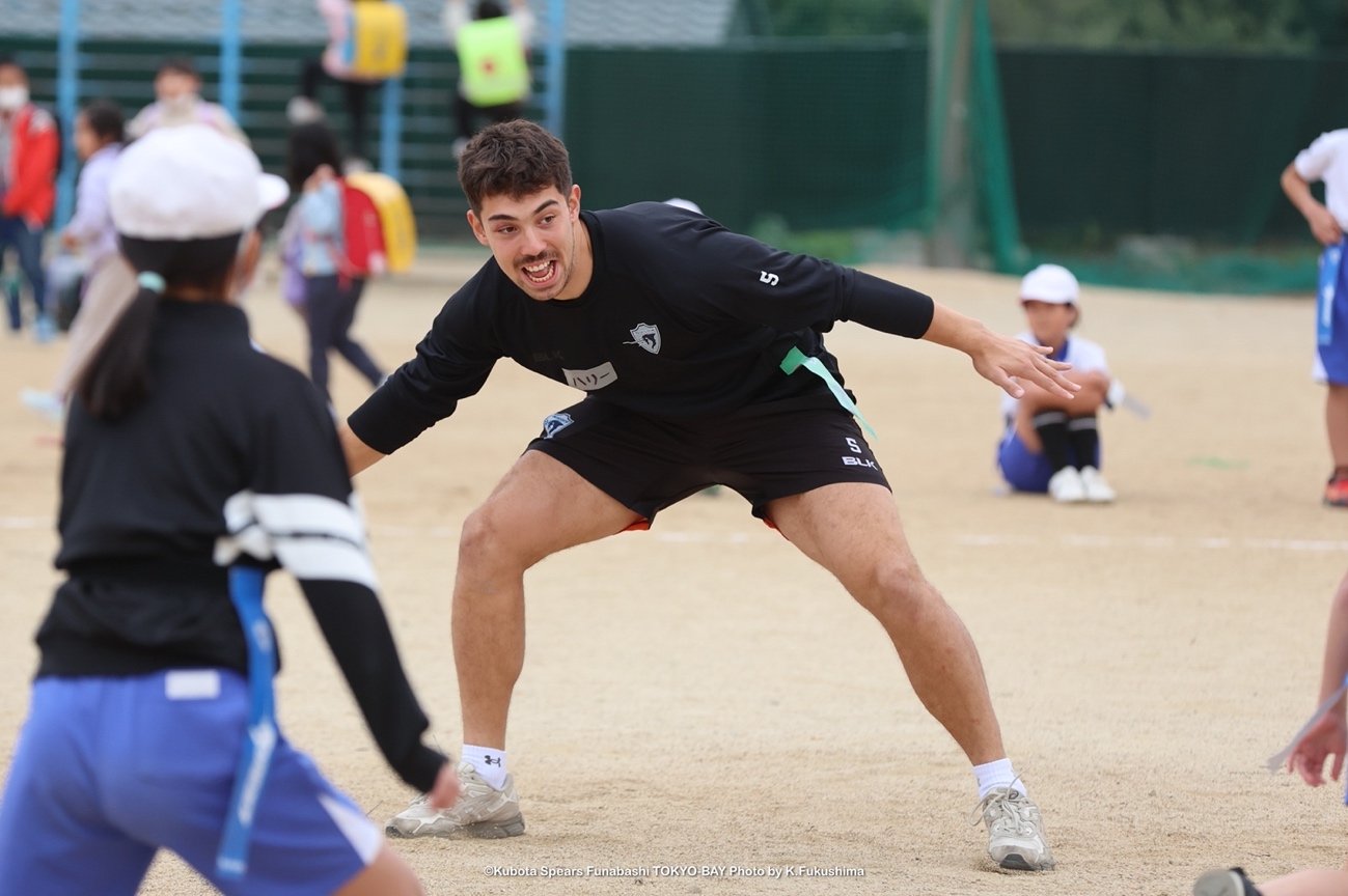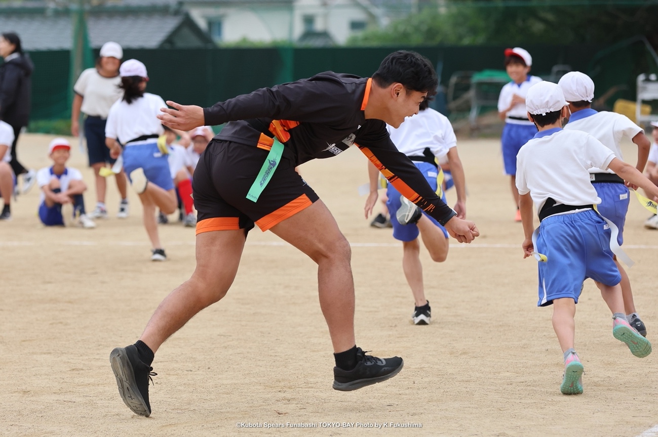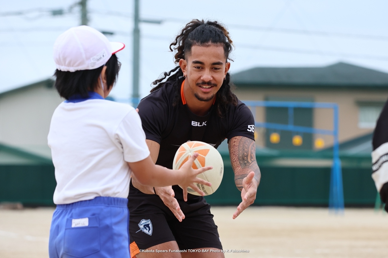 クボタスピアーズ船橋・東京ベイは、ラグビーの普及とスポーツの楽しさを知ってもらうことを目的に、 ホストエリアを中心としたタグラグビー教室を実施しています。タグラグビー教室では、育成スタッフのリードのもと現役選手たちが児童たちに直接指導し、タグラグビーを通して楽しく安全に交流しています。